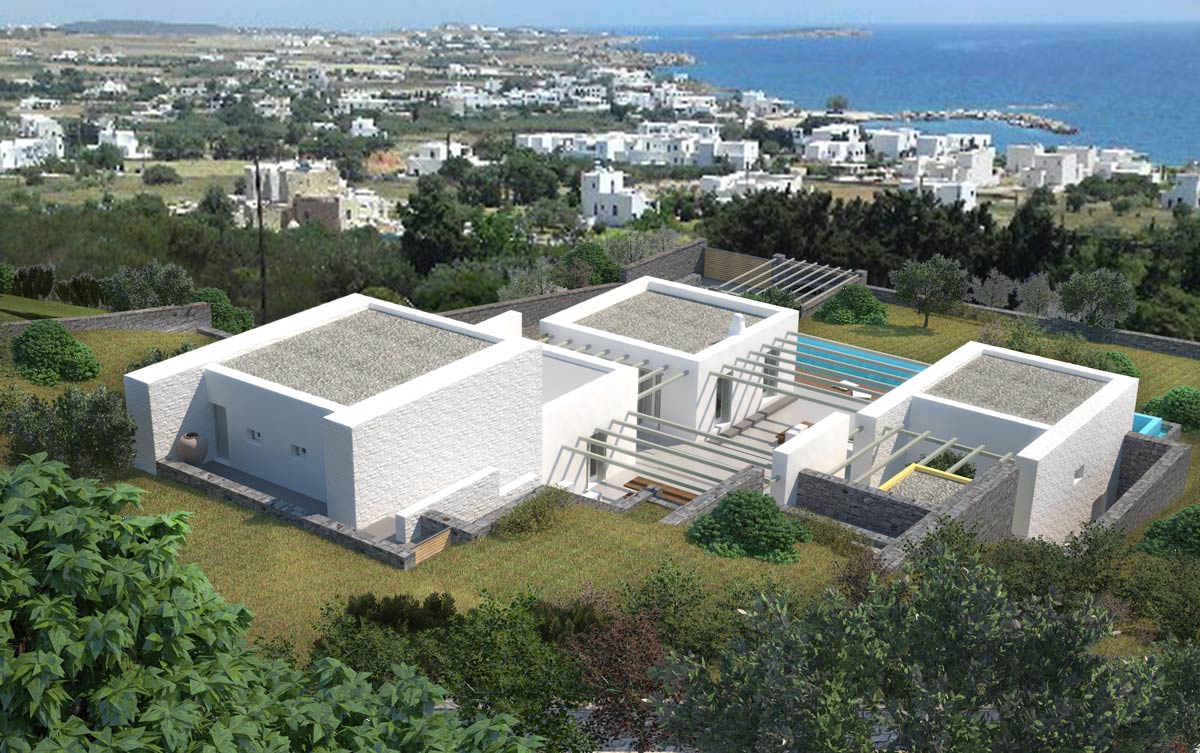 Στόχος της αρχιτεκτονικής σύνθεσης ήταν η σχεδίαση μιας θερινής κατοικίας σύμφωνα με τα πρότυπα των τοπικών κατοικιών, όπου κάθε κτίριο λειτουργεί ανεξάρτητα από το άλλο και οι εξωτερικοί χώροι παραμένουν ζωντανοί λόγω της κυκλοφορίας από τον έναν κτιριακό όγκο στον άλλο, συνιστώντας το σημείο συνάντησης των κατοίκων και τόπο χαλάρωσης. Οι τρεις κτιριακοί όγκοι στο ισόγειο καλύπτουν τις βασικές απαιτήσεις της κατοικίας. Το τέταρτο σχεδιάστηκε έτσι ώστε να καλύπτει λειτουργικές και βοηθητικές ανάγκες και να συνδέει τους κτιριακούς όγκους. Η ενδιάμεση σύνδεσή τους πραγματοποιείται με λευκές ξύλινες πέργκολες από πλανισμένη ξυλεία που συνδέονται με την αυστηρή, γραμμική εντύπωση του οικοδομικού συνόλου. Το απρόσκοπτο φως διαπερνά το κέντρο των κινήσεων, δημιουργώντας ένα παιχνίδι σκιών. Οι δύο εμπρόσθιοι κτιριακοί όγκοι που είναι στραμμένοι ανατολικά και η πισίνα φιλοξενούν το καθιστικό και το κυρίως υπνοδωμάτιο αντίστοιχα. Ανάμεσά τους βρίσκεται το υπαίθριο καθιστικό. Η άμεση πρόσβαση από την κρεβατοκάμαρα στην πισίνα δίνει την εντύπωση ότι η επιφάνεια του νερού αγγίζει το κτίριο. Οι άλλοι δύο κτιριακοί όγκοι της κατοικίας είναι ένα επίπεδο πιο ψηλά. Ο ένας στεγάζει μια κουζίνα μοντέρνου σχεδιασμού με υψηλές τεχνολογικές προδιαγραφές, δίνοντας έμφαση στις λεπτομέρειες, δίπλα στην αίθουσα τηλεόρασης, αίθουσα παιχνιδιών, χώρο φιλοξενίας και μπάνιο. Λόγω της απότομης κλίσης του χώρου, ο τέταρτος όγκος κτιρίων διαθέτει υπόγειους βοηθητικούς χώρους για την κατοικία και την πισίνα, που περιλαμβάνουν αποδυτήρια με εξωτερικούς ντους. Υπάρχουν κατασκευές υψηλής ποιότητας με κινητά ή προκατασκευασμένα αρχιτεκτονικά στοιχεία. Δύο ξενώνες βρίσκονται πάνω από έναν υπόγειο χώρο, στο επίπεδο του ισογείου. Το πέρασμα μεταξύ των βοηθητικών χώρων και της κουζίνας είναι ελαφρώς ανυψωμένο, η υπαίθρια τραπεζαρία έχει θέα στη θάλασσα χωρίς να παρεμποδίζεται από τα εξωτερικά καθίσματα. Στους εσωτερικούς χώρους, οι κοινόχρηστοι χώροι έχουν εκτεταμένες οροφές από σκυρόδεμα, ενώ οι ιδιωτικοί χώροι έχουν ανώμαλες ξύλινες οροφές σε λευκό χρώμα. Με έμπνευση από την παραδοσιακή κυκλαδική αρχιτεκτονική, ενσωματωμένα χαρακτηριστικά με στρωμένο τσιμεντοκονίαμα σχεδιάστηκαν στα μπάνια και στους πρόσθετους χώρους της κατοικίας. Η επίστρωση με τσιμεντοκονίαμα σε φυσικές αποχρώσεις μαζί με ξύλο χρησιμοποιήθηκαν στα δάπεδα. Ο αρχιτεκτονικός φωτισμός συμβάλλει στον διαχωρισμό των όγκων της σύνθεσης, προσφέροντας μια αίσθηση χαλάρωσης. Η βλάστηση στις γύρω περιοχές και οι πράσινες στέγες δημιουργούν μια αίσθηση συνέχειας με το φυσικό τοπίο.